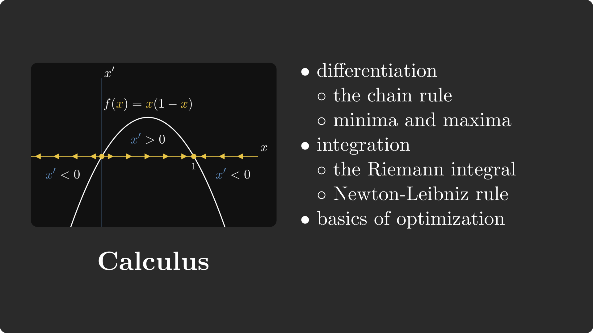 Calculus is the study of differentiation and integration of functions. Essentially, a neural network is a differentiable function, so calculus will be a fundamental tool to train neural networks, as we will see.