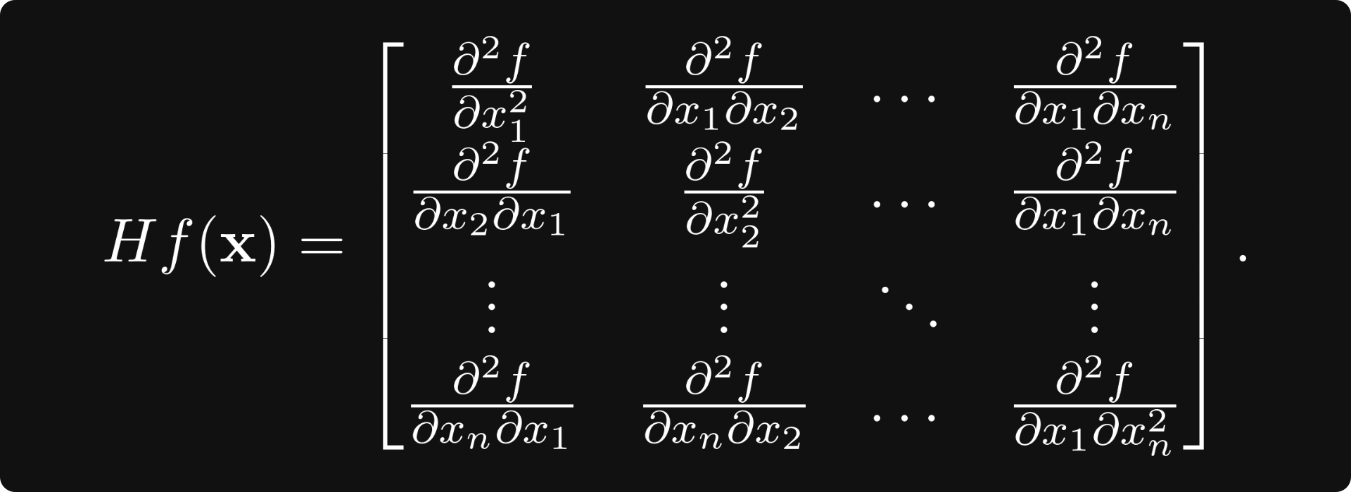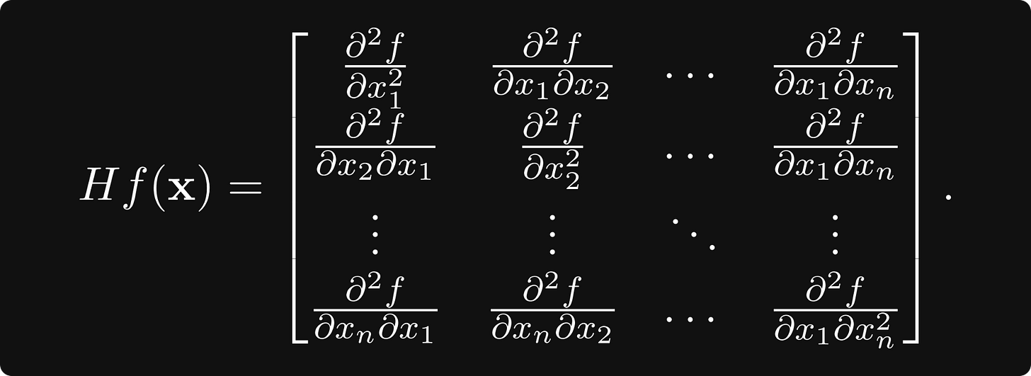 For a general differentiable vector-scalar function of n variables, there are n² second derivatives, forming the Hessian matrix