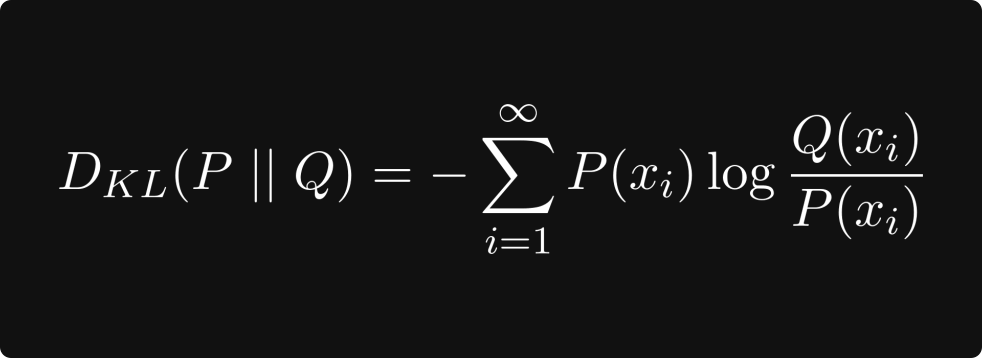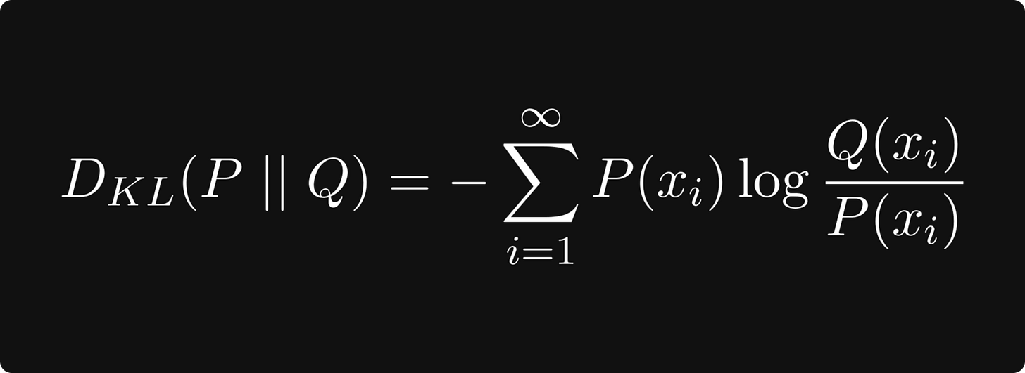 where P and Q are two probability distributions. This is essentially cross-entropy minus the entropy, which can be thought of as quantifying the difference between the two distributions. This is useful, for instance, when training generative adversarial networks. Minimizing the Kullback-Leibler divergence guarantees that the two distributions are similar.