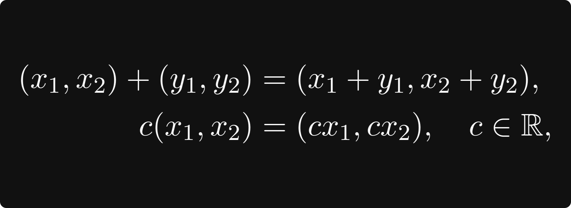 When thinking about vector spaces, it helps to model them as tuples in Euclidean space mentally.