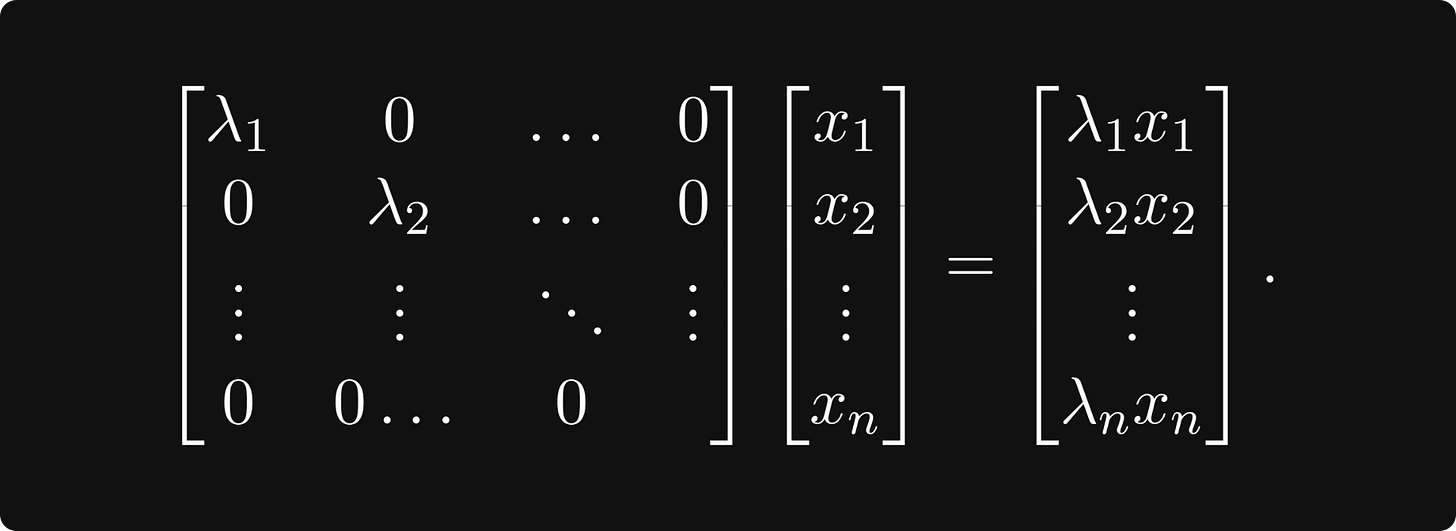 At this point, you are ready to familiarize yourself with a few matrix decompositions. If you think about it for a second, what type of matrices are the best from a computational perspective? Diagonal matrices! If a linear transformation has a diagonal matrix, it is trivial to compute its value on an arbitrary vector: