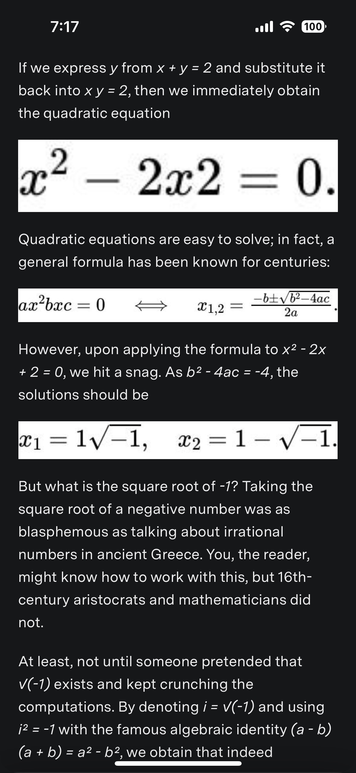 Around the 16th century, aristocrats had a strange way of determining who the king of the hill was: solving algebraic equations. One particular problem was the following: find two numbers whose sum and product are equal to two; that is,